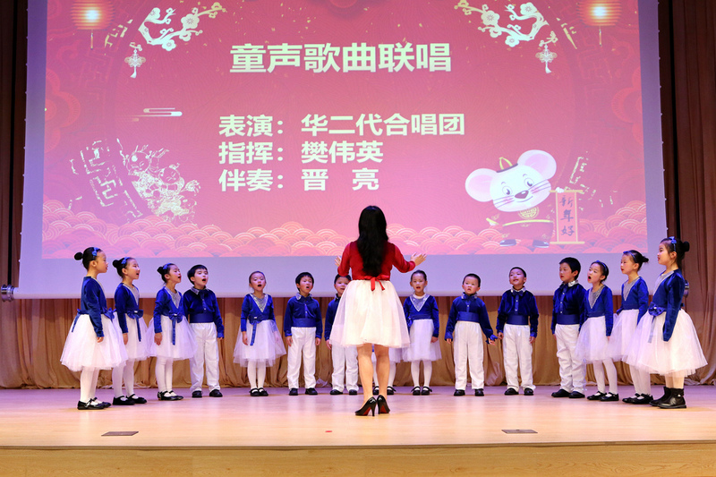 校教职工舞蹈协会、朗诵协会、瑜伽协会、京剧协会、合唱团、亲子协会、小红花幼儿园等近120名教职工和“华二代”联手送上了一份绚丽多姿、精彩夺目的新春文化大礼包。校工会常务副主席朱姝和工会副主席朱志华、王莉、陈涛,以及部分学院工会主席、优秀社团代表、社团积极分子等逾200人观看了演出。