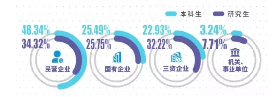 在签约就业的本科毕业生中,就业单位性质流向比例从高到低依次是民营企业、国有企业、三资企业、机关和事业单位(包括政府机关、高校、科研院所及其他事业单位),分别占总就业人数的48.34%、25.49%、22.63%和 3.24%;在签约就业的毕业研究生中,就业单位性质流向比例从高到低依次是民营企业、三资企业、国有企业、机关和事业单位,分别占总就业人数的 34.32%、32.22%、25.75%和 7.71%。