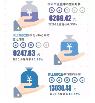 在薪酬方面,据统计,2019届本科毕业生平均签约月薪为6289.42元,较2018届增长6.35%;硕士研究生(不含MBA)平均签约月薪为9247.83 元,较2018届增长10.95%;博士研究生平均签约月薪为13030.48元,较2018届增长16.72%。