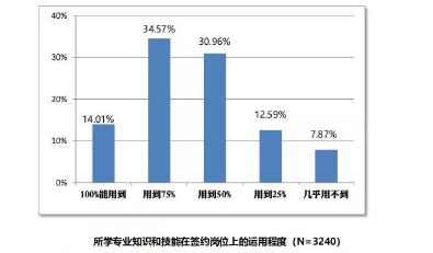 调查问卷还要求毕业生对自己的专业知识与技能在就业岗位上的运用程度做出主观评估,借此了解就业岗位与毕业生所学专业的对口度。调查结果表明,认为所学专业知识运用程度高100%的毕业生占14.01%,65.53%的毕业生认为能够运用50%-75%的专业知识,总计79.54%的毕业生就业岗位与专业较为对口,较 2018 年提高1.85个百分点。