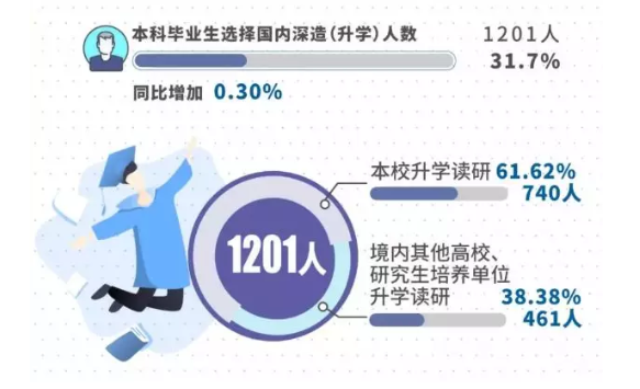 华东理工大学2019届本科毕业生3789人,落实毕业去向的本科毕业生占96.23%。其中,1962人落实工作,1201人境内升学读研,483人出国(境)留学。毕业研究生共计 2798 人,落实毕业去向的毕业研究生97.43%,其中,2652人落实工作,44人境内升学攻读博士或从事博士后研究,30人出国(境)留学。