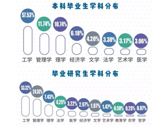 作为一所以工科见长的综合性大学,华东理工大学2019届毕业生工学学科毕业生超过一半。本科毕业生分布在工学、管理学、理学、经济学、文学、法学、艺术学、医学8个学科门类,其中工学学科毕业生占57.53%;毕业研究生分布在工学、管理学、理学、法学、医学、经济学、文学、艺术学、教育学、农学、哲学等11个学科门类,其中工学学科毕业生占 53.32%。