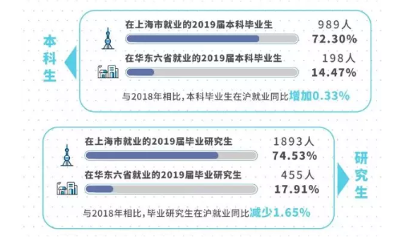 从流向地域上来看,本届本科毕业生中,在上海市就业的989人,占签约就业本科生总人数的72.30%。毕业研究生在上海市就业的1893人,占签约就业研究生总人数的74.53%。总计96.86%的本科毕业生和97.32%的毕业研究生面向“一带一路”和长江经济带省份就业。