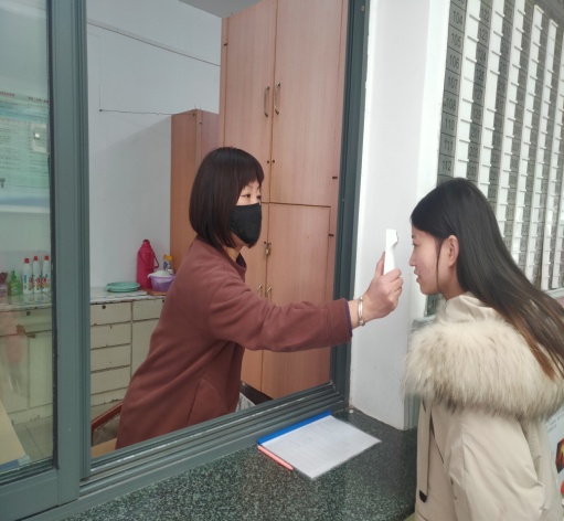 虽然寒假期间14舍只有3人留校,但是只要有人在,她就要负责保护好楼里的每一名学生的安全,做好门卫的守护工作:登记学生的出入记录,负责给学生测量体温,每天早上给楼宇学生经常出入的地方进行消毒工作。