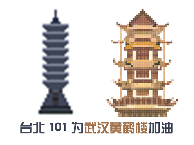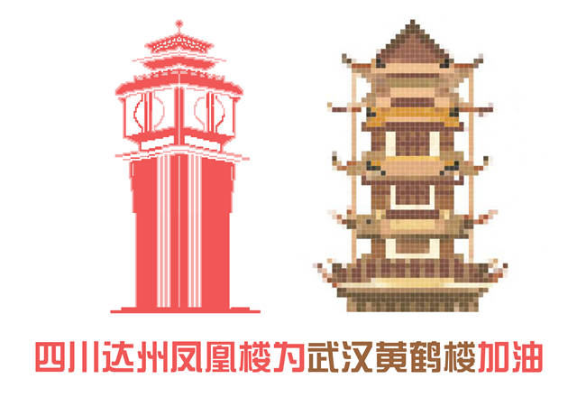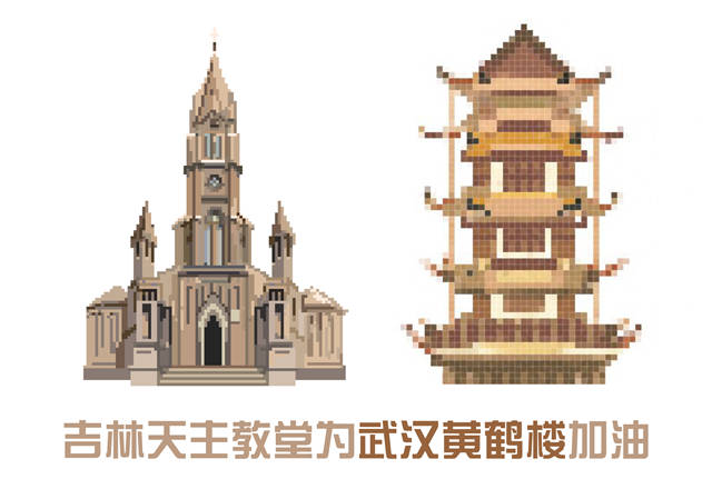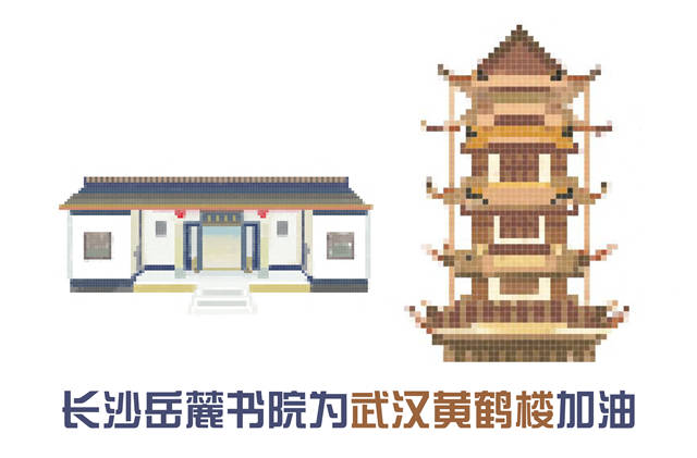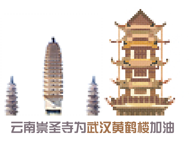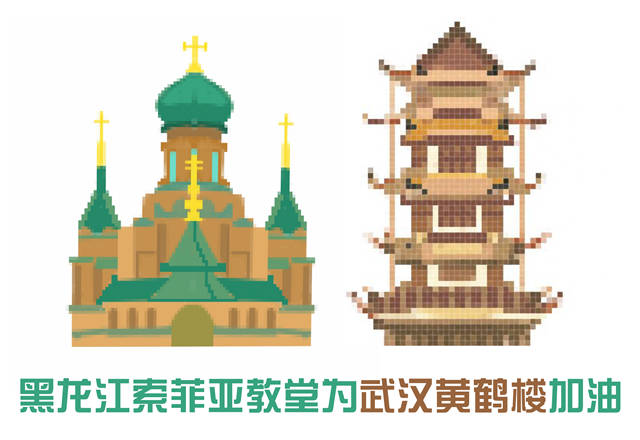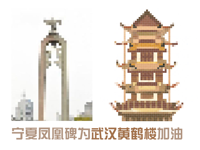 浙江红船为武汉黄鹤楼加油、山东孔府为武汉黄鹤楼加油、湖南岳麓书院为武汉黄鹤楼加油、北京天坛为武汉黄鹤楼加油、天津之眼为武汉黄鹤楼加油……
