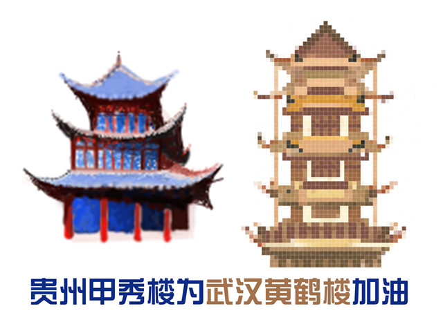 在各省份代表建筑绘制完成后,由两名大二同学进行统一排版,将每个代表建筑与武汉黄鹤楼进行结合,并加上一段祝福的文字。
