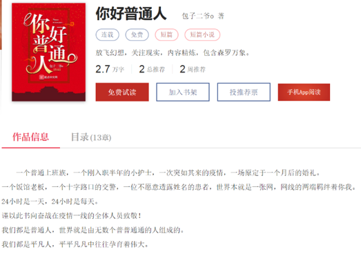 “同为90后,人们常调侃我们是‘佛系’的一代,其实每个人都很不容易,人心是共通的。世界本就是一张网,网线的各端羁绊着你我。”身居山东聊城的网络作家姚丽娜生于1993年,去年开始全职网文写作,她以笔名“包子二爷”投稿的小说《你好普通人》,正取材于当下这场没有硝烟的战疫。