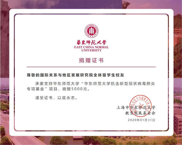 华东师大国际关系与地区发展研究院全体留学生第一时间发出捐款倡议,委托华东师大基金会向武汉大学人民医院集体捐赠人民币5000元,用于支持疫情防控工作。