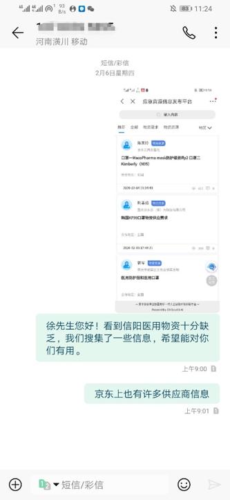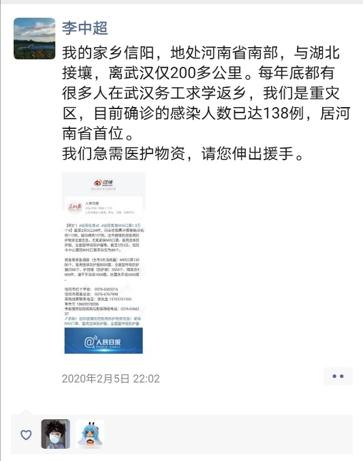 此外,他第一时间在公益平台上进行捐款,并在得知自己家乡信阳市短缺医疗救援物资时,急忙编辑了相关的求助信息,并在班级群、朋友圈转发扩散。同时,他在网上搜集一些生产医疗救援物资的企业信息,并且把有效的信息发给了信阳红十字会。