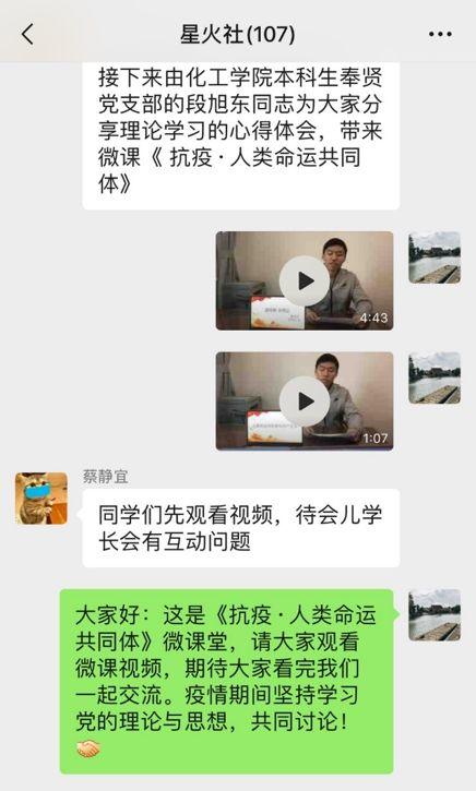 同时,他还是理论学习型社团“星火社”的老社长。因此,他将自己对党的系列理论的理解录成了微课视频,通过“星火社”的线上读书交流分享会,与同学们共同学习交流,鼓励引导同学们在思想上筑牢战线、增进认同,呼吁更多大学生青年和党员为中国故事发声、为抗击疫情发声。他说,相信当疫情驱散那天,我们走向中华民族伟大复兴的脚步将会更加踏实而坚定!