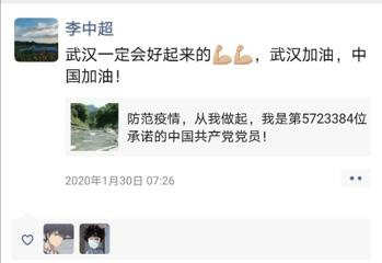 作为一名党员,他配合辅导员做好排查摸底的工作,积极宣传科学的防疫知识。身处重点疫区的他,深知有不少和他一样的同学可能会产生负面情绪,他第一时间将身边湖北的同学拉入微信群,互相打气加油,用自己的心声鼓励大家不焦虑、不恐慌、不信谣、不传谣!