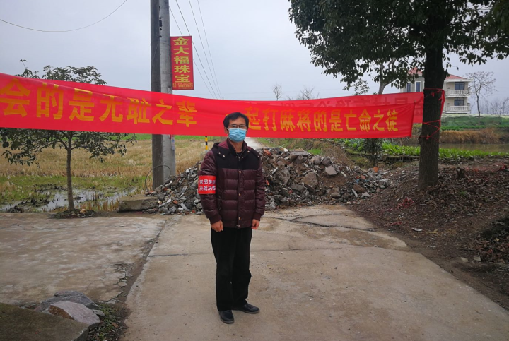 饶志雄所处的湖北省咸宁市金星村也是县里疫情较为严重的灾区,他以身作则,当好表率,响应当地政府号召,主动请缨参加了村委疫情联防联控工作。其主要工作包括:一是看守一条已封闭的道路,防止村内外人员翻越;二是佩戴“党员先锋、决战决胜”袖章,跟随其他工作人员在村里进行巡逻,宣传政策,对未戴口罩、聚集聊天、打麻将打牌等不当行为进行劝阻;三是担任村里11户人家的十联户联防长,宣传、督促疫情防控“十严禁”要求,关心11户家庭的生活情况,及时向村里负责采购的工作人员汇报。