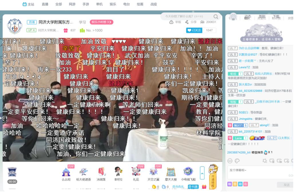 同济大学等沪上高校约20万青年学子通过bilibili视频网站在线听课,并与前方医疗队员们互动,送上由衷的敬意与温暖的祝福。在直播正式开始前,一条条温暖的弹幕就一次次刷屏。一个小时内,累计弹幕3万余条。