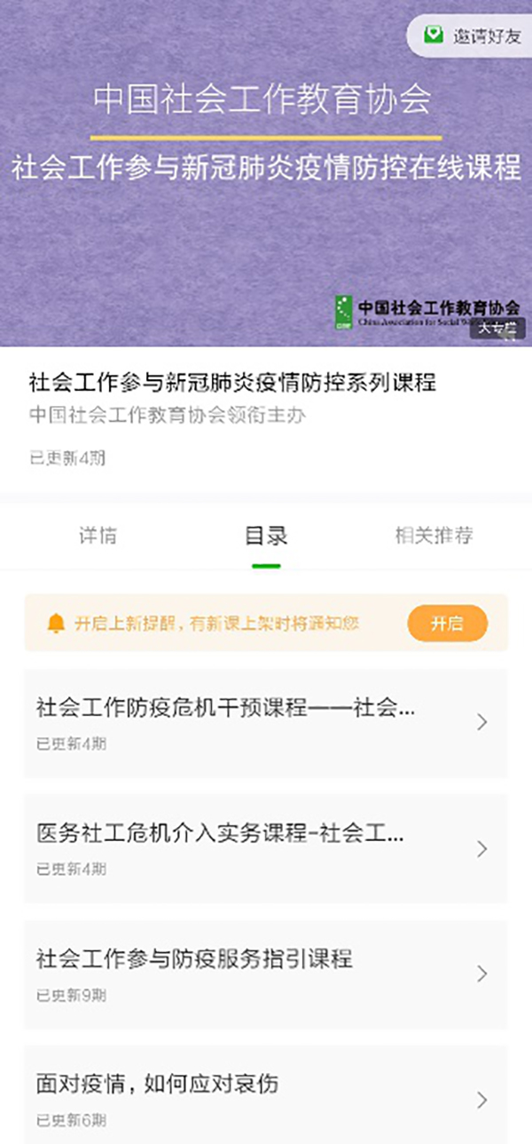 “新冠肺炎暴发以来,我们作为专业人士非常敏感地意识到疫情会对整个社会运行和人民生活产生的影响。这样大规模的社会重大事件下,受影响的家庭和个人数量巨大,如何预防问题的发生,解决问题,是我们工作的重心。”中国社会工作教育协会副会长兼秘书长、北京大学教授马凤芝是“在线课程”的总设计者,她告诉澎湃新闻记者,1月22日,中国社会工作教育协会已经意识到这是一次重大社会事件,开始着手准备相关为受疫情影响的个人、家庭、社区服务的社会工作培训课程。截至目前,已经制作了35堂在线课程,将逐步在线上推出。