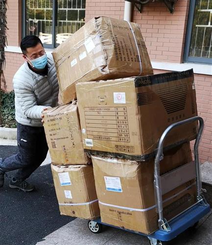 防控物资准备是最重要的环节之一,直接关系到此次防疫工作的成效。在防疫初期,魏广斌就和班子成员一起,四处筹措购买,抢购到了急需的防护物资,保障了留校师生员工的正常使用。每天按照在岗人数精准发放防疫物资,确保物资用好、管好;组织师生分时间段领取,以减少人员聚集。同时,他也努力购买到了质量优良的防护服、防护眼镜、消毒剂等紧缺物资。无论清晨或夜晚,物资一到,他便带头推着板车穿梭在校园中,协调医护人员进行物资清点、查验,做好入库登记。他说,辛苦的奔波也是收“货”(获)的快乐,“多来一份物资,师生就多一份保障,校园就多一道防护的屏障。”
