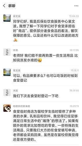为扎实做好疫情防控期间的餐饮保障工作,自寒假开始后他每天来学校,主动查找不足,想办法改进工作。为了控制好就餐人员的间隔,裴文波想了个办法,给固定座椅贴上“席卡”,一人一座,解决了固定桌椅的先天缺点。学校施行封闭式管理,四食堂也承担起了“临时商业街”的功能,他主动加入留校学生微信群,了解学生需求,有针对性地进行采购,细致、温暖的服务保障也迎来了同学们的认可。