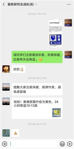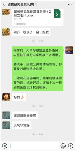 假期里,由于封校管理,有部分同学要办理住院手续,魏广斌就通过电话联系,事先准备好相关资料,开好住院结算凭证,和学生家长确认好时间后送到学校大门口。有外省同学要办理参保证明急用,他会仔细确认信息、开具证明,通过微信发给外地同学,帮他们解燃眉之急。他时常在留校研究生的群中,提醒大家注意天气变化、防寒保暖。“口罩还够用吗?如果还需要,统计好来校医院找我领取”,句句叮嘱虽然简单,但很温暖。