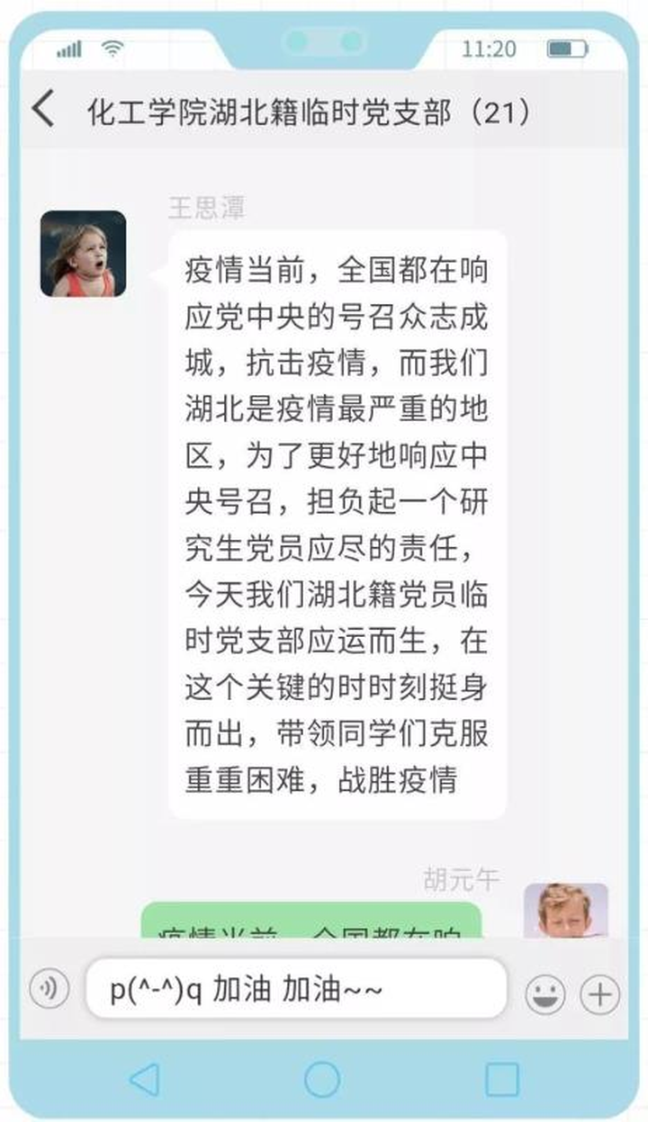 为了更好地发挥研究生党组织的战斗堡垒作用,2月6日,华理化工学院、化学与分子工程学院、资源与环境工程学院分别成立了湖北籍研究生临时党支部,寒假返乡的资环学院党委副书记饶志雄和化学院研究生辅导员傅翠萍分别担任所在学院临时党支部书记。临时党支部通过线上组织生活,学习贯彻习近平总书记的重要指示和党中央、国务院关于防疫工作的决策部署,积极发挥党员的先锋模范带头作用,帮助大家正确认识疫情、传播科学防控知识,动员全体学生做好防疫工作,讲述身边人的防疫故事、自己的防疫体会,帮助身在疫区的同学们走出心理阴霾,带领身边同学正确认识看待疫情,坚定打赢防控战的信心,营造良好的舆论氛围,让广大党员做好家人及周边亲友的防疫科普宣传和心理健康建设。