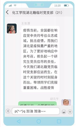 为了更好地发挥研究生党组织的战斗堡垒作用,2月6日,华东理工大学化工学院、化学与分子工程学院、资源与环境工程学院分别成立了湖北籍研究生临时党支部,寒假返乡的资环学院党委副书记饶志雄和化学院研究生辅导员傅翠萍分别担任所在学院临时党支部书记。