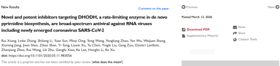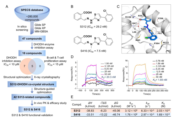 此项研究中,研究团队发现并验证了宿主细胞的二氢乳清酸脱氢酶(DHODH)抑制剂,能够通过抑制病毒复制和调节免疫两种途径,发挥广谱抗病毒药效,发现老药来氟米特(Leflunomide)和特立氟胺(Teriflunomide)可满足目前新冠病毒肺炎临床急需。同时,新设计的候选药物S312和S416也有望开发成为抗RNA病毒的特效新药,为将来冠状病毒及其他急性RNA病毒的感染性疾病防控战做好了候选药物储备。