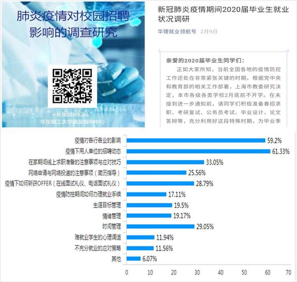 为加强疫情影响的分析研判,就业中心于2月9日—2月14日分别面向用人单位和2020届毕业生开展了新冠肺炎疫情的影响调研。通过问卷星、电话沟通等多种形式主动对接了中国石化、中国商飞、中建集团、万华化学、中兴通讯、海康威视等500余家重点单位,详细调研其招录需求和后续招聘安排等,并据此建设用人单位“线上招录需求库”,全力确保招录工作稳定性。在面向毕业生的调研中,共收到有效问卷1539份。对于毕业生“疫情期间迫切关注的就业相关问题”,依次为“疫情下用人单位的招聘动态”(61.34%)、“疫情对各行各业的影响” (59.26%)、“在家期间线上求职准备的注意事项与应对技巧”(33.14%)、“时间管理”(29.04%)、“疫情下如何斩获OFFER(在线面试礼仪、电话面试礼仪)”(28.72%)等。