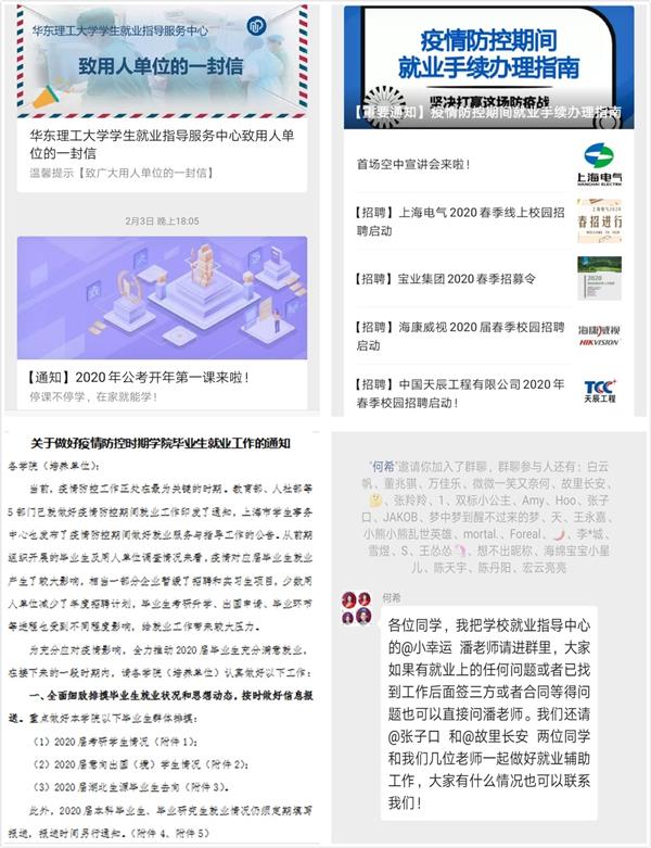 面对突发的新冠肺炎疫情,华东理工大学第一时间启动疫情期间稳就业工作方案,要求全员出动,主动出击,做到工作“不松懈”、服务“不断线”、效果“不打折”。为最大限度降低疫情对毕业生就业工作的影响,学校就业中心按学校部署立刻投入到这场没有硝烟的战斗中,将全部工作转移到线上,并发出《致用人单位的一封信》和《致2020届毕业生的一封信》及时告知相关工作调整安排。同时,坚持需求导向、创新举措、精准施策,通过“云就业”“云咨询”“云指导”“云调研”“云服务”等精准化举措帮助毕业生努力实现安心学习、毕业就业两不误。
