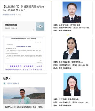学校邀请6位基层一线优秀校友,与学弟学妹们相聚云端,畅谈“三支一扶”“西部计划”等项目,包括政策详情、备考经验、待遇发展和工作体悟等;邀请4位签约重点单位的往届退伍校友与在校生云端共话“强军故事”,从求职择业角度分享军旅生活在自身成长和职业发展方面带来的助力;结合学校的就业引导工程,挖掘就业导向单位和地区的校友典型,在“华理就业领航号”推出《追梦人》生涯故事。通过发挥校友的引领辐射作用,培养学生“志在四方”的就业观念,引导学生到符合党的事业和国家战略需要的岗位上去。