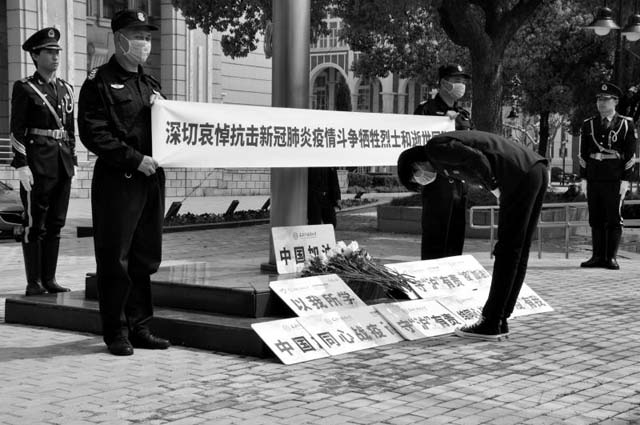 今天上午,复旦大学上海医学院西苑同生广场上气氛肃穆凝重。10时整,校园上空防空警报鸣响,复旦上医师生员工、医务工作者代表100余人在广场上垂手肃立,庄严默哀三分钟,哀悼抗击疫情斗争中的牺牲烈士和逝世同胞。与此同时,上海外国语大学、上海健康医学院等在沪高校举行特别的升旗仪式,更多的学子则在家中参与了默哀。