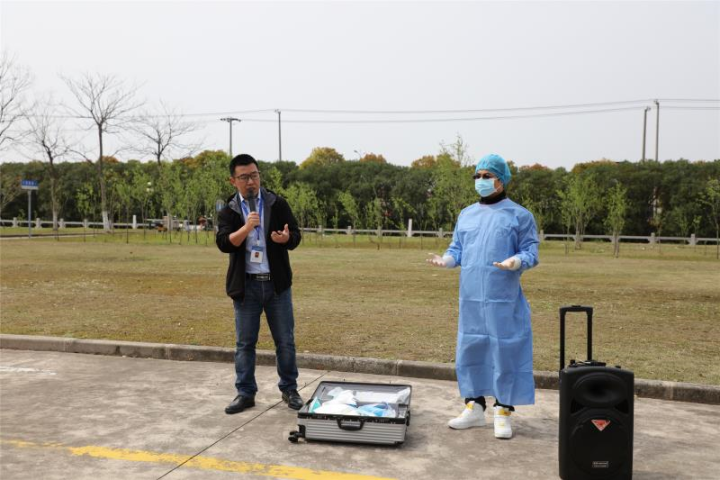 奉贤区疾病预防控制中心传染病防治科副科长王志,为现场师生进行了防护技能培训。他首先介绍了口罩的不同类别及其对应的适用环境,并现场演示手部清洁的动作要点和注意事项、防护服的穿戴方法及穿脱顺序等,旨在确保参与演练人员掌握基本防护技能,为学生返校做好充足的防护准备。