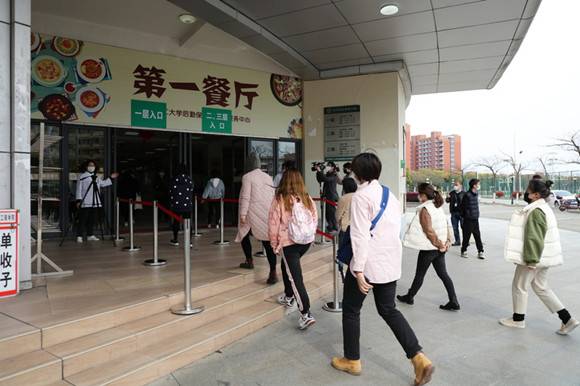在就餐环节,师生有序排队,进行体温监测后进入指定食堂;食堂内设置取餐动线标识和人员分流围隔,引导师生动向,避免拥挤;疫情期间,师生就餐将以打包为主,按照宿舍楼区分就餐食堂,并以宿舍为单位进行取餐。