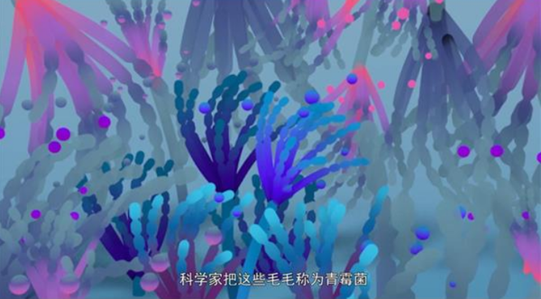 “在青霉素培育菌种和结晶实验的过程中有着许多大众所不熟知的微观化学反应,按照以往的讲解方式,往往使得受众没有充分的空间想象能力,而我们将水分子等一些微观世界的角色进行了卡通动画的设计,便于受众更好地理解个观看,让整个化学实验充满画面感和趣味性。”孙一文说。