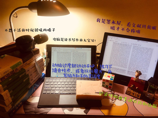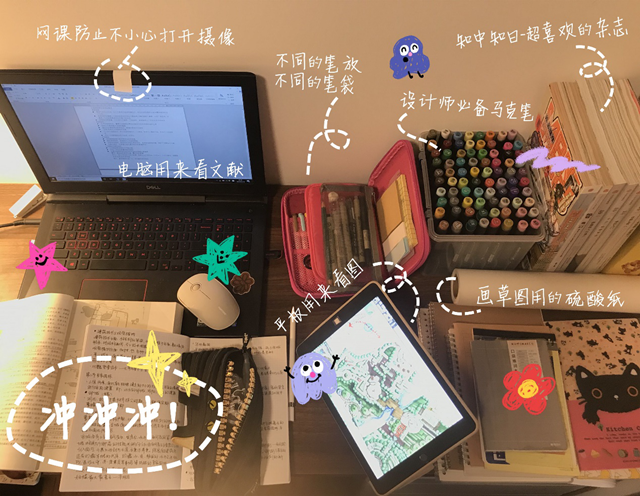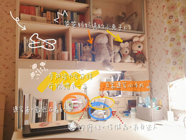 “碎花墙纸+碎花窗帘”不知道算不算是在花园里学习的花园宝宝了!速写本和小卡片一直放在书桌上,学累了就戴上肩颈按摩仪画几张画。学习+养身+休闲,这可能就是当代大学生的生活写照吧。