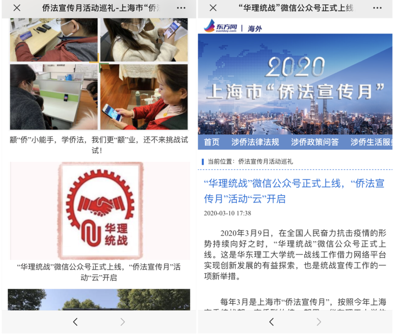 上海市把每年三月份作为“侨法宣传月”。今年侨法宣传月的主题是“知侨法、懂侨法、用侨法、护侨益”。因受疫情影响,党委统战部在“云”端开启了“侨法宣传月”活动,依托新开通上线的“华理统战”微信平台,以及统战部网站、侨台联、欧美同学会、致公党等统战工作群等,多渠道联动,积极宣传侨务法律法规、涉侨政策,发动广大侨界朋友和海外归国人员踊跃参加“‘侨侨’你知道多少——侨法知识网上挑战赛”。活动期间,我校的活动也在东方网《2020年上海市“侨法宣传月”》专栏进行了宣传报道。