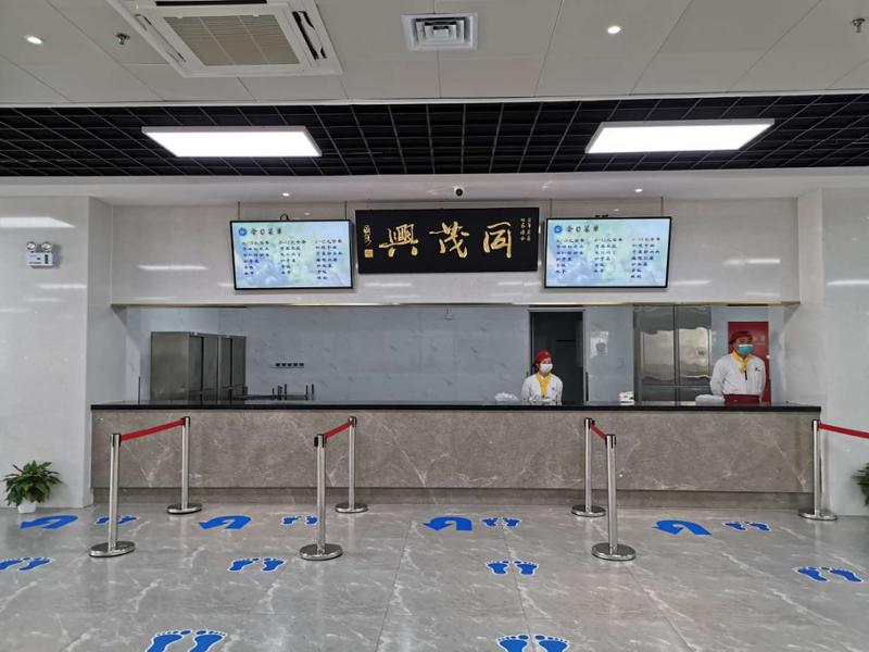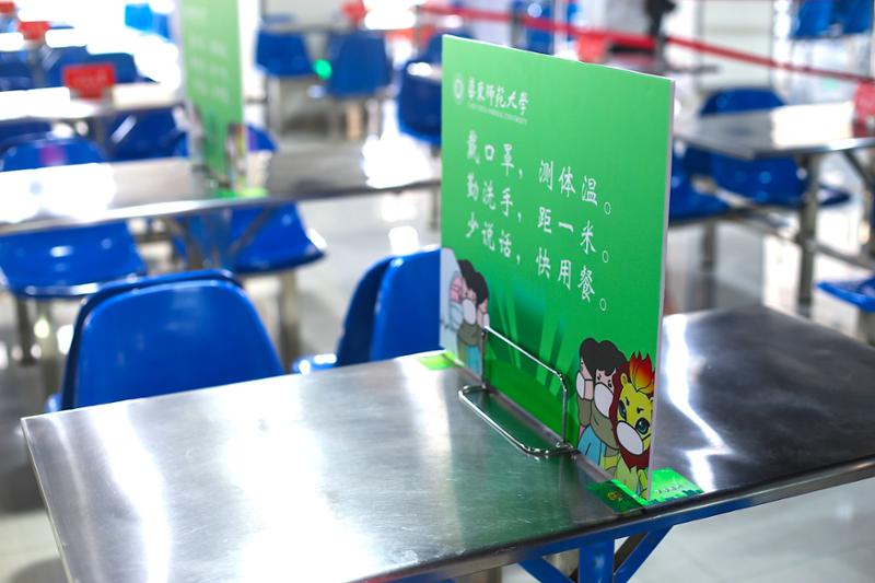 返校开学前,食堂就餐人不多的时期,采用一人一桌,同向就坐用餐;返校开学后,食堂就餐人数增加,采用“十字”“一字”等隔离板,座位隔离就坐用餐。同时,继续做好食堂垃圾分类。
