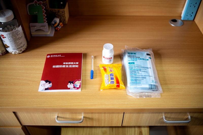 记者在学生宿舍看到,学校为每位学生准备了防疫物资。“目前,我们已经储备了近50万个口罩。”戴立益告诉劳动报记者,目前的储备可以满足为1.5万名分批返校生在6月1日之前每天提供一个口罩。“我们先为每个同学发15个口罩,保证每人一个水银体温计,每人一瓶消毒洗手液。”