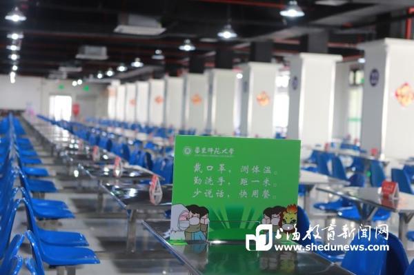 重启“校园生活”后,食堂是人群聚集的又一“高危区”。位于华师大中山北路校区的学生食堂实行单向进出,进口提供免洗手消毒液,使用一米线间隔标识,有专人测体温。根据预案,食堂将延长供餐时间,分批分时错峰就餐。同时,食堂还调整菜单,以快餐方式提供A、B、C套餐。每个餐厅开设盒饭套餐外带专窗,鼓励师生打包外带就餐,降低交叉感染风险。