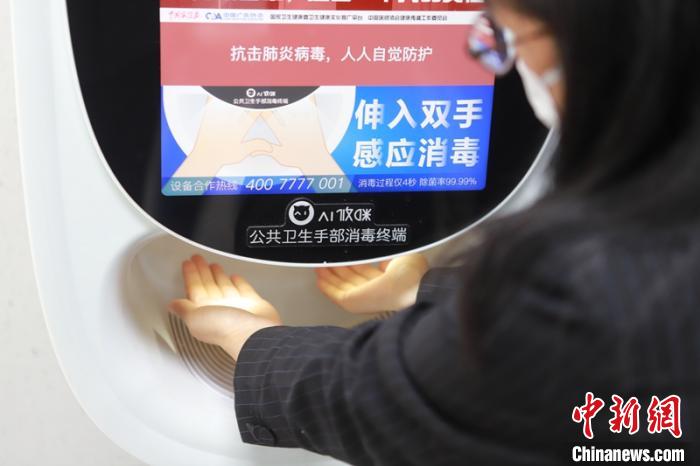 华东理工大学徐汇校区第一食堂安装了无接触的手部消毒终端。 谈乐达摄