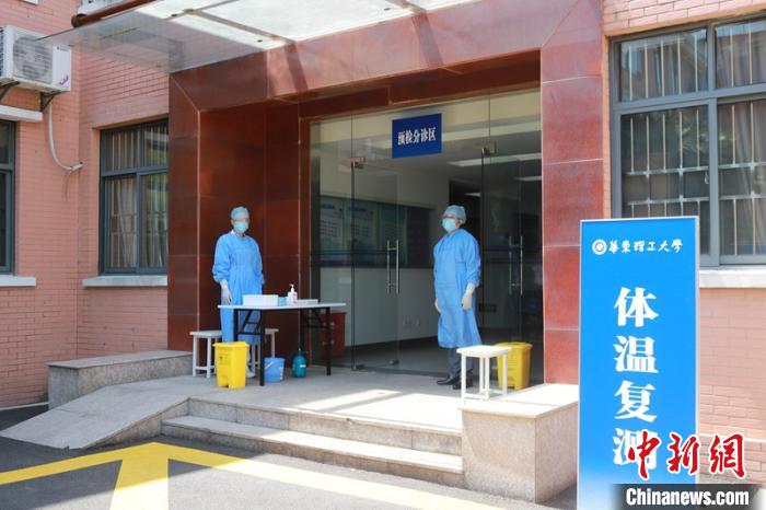 华东理工大学返校学生若有发热情况,将在辅导员陪同下来到校医院,在预检分诊区复测体温。 谈乐达摄