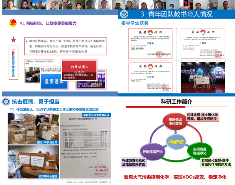 4月22日下午,2019年度“华东理工大学青年五四奖章”视频评审会举行。20位个人候选人和6个集体候选团队结合各自在2019年开展的工作实际,从教书育人、学术科研、管理服务、抗疫工作表现等多个方面进行了线上答辩展示。校办、组织部、宣传部、教师工作部、学工部、工会、教务处、研究生院、科研院、校友与发展联络处、保卫处、团委等部门主要负责同志担任评委。