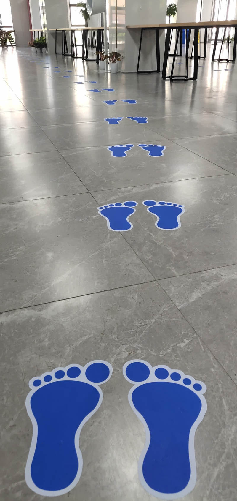 随申码审核、测体温、登记、就餐……记者一路上跟着很多“小脚丫”,这是华东理工大学为了让学生们保持安全距离的小妙招,间隔一米的小脚丫整整齐齐地标志在地上,不自觉地,就让大伙按安全距离排好了队。