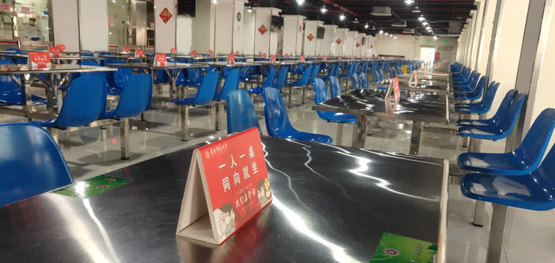 每个餐厅开设盒饭套餐外带专窗,分批分时错峰就餐。返校开学前,食堂就餐人不多的时期,采用一人一桌,同向就坐用餐;返校开学后,食堂就餐人数增加,采用“十字”“一字”等隔离板,座位隔离就坐用餐。同时,改变菜肴结构、菜单,以快餐方式提供A、B、C套餐,注重营养结构、清淡适口。食堂