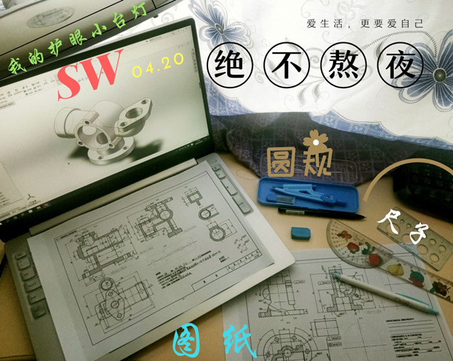 电脑上是自学画的图,桌面上是这周的工图作业。绝不熬夜,是我最后的倔强……