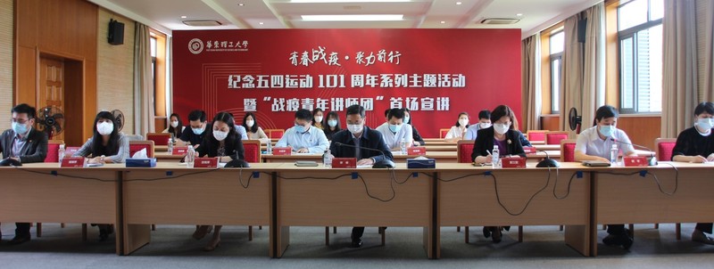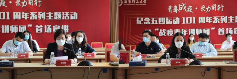 会上,夏江雯宣读了《关于成立华东理工大学“战疫青年讲师团”的决定》,12名政治素质过硬、亲身参与防疫抗疫的优秀华理青年,将用战“疫”一线的鲜活事迹和生动故事为新时代华理青年的成长成才注入强大动能。沈悦萍宣读了《华东理工大学关于表彰2019年度“青年五四奖章”的决定》,希望全校团员青年以受表彰的先进集体和个人为榜样,为实现中华民族伟大复兴的中国梦贡献青春力量。侯宇介绍了我校防疫志愿服务的相关情况。