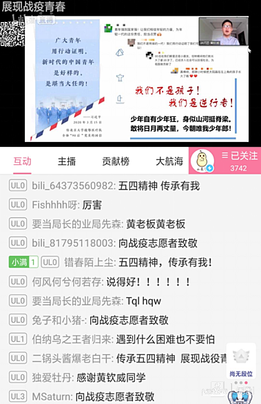 华东理工大学启动“战疫青年讲师团”计划。今年“五四”青年节,“战疫青年讲师团”首场宣讲活动通过B站直播在线举行,分享战疫故事。一个多小时的直播,吸引近三万观众。