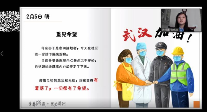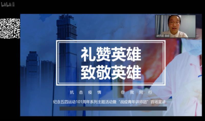 “这场防疫阻击战,必将成为我们新时代中国青年的成人礼,也将成为激励我们前赴后继、为国奉献的里程碑。”来自华东理工大学马克思主义学院的研究生施健通过哔哩哔哩网站,这样直播分享自己的战疫故事……5月3日,华东理工大学“青春战疫聚力前行”纪念五四运动101周年系列主题活动暨“战疫青年讲师团”首场宣讲活动在B站直播在线举行,活动现场,华理启动“战疫青年讲师团”计划,包含新冠疫情武汉阻击战亲历者、湖北抗疫前线医护人员子女、科研抗击疫情中青年教师、社区疫情阻击战中志愿者在内的12位亲身参与中国抗击疫情的青年师生,将战“疫”一线的鲜活事迹,请进思政课堂。他们用生动的故事讲述中国自信,为新时代青年成长注入强大动能。