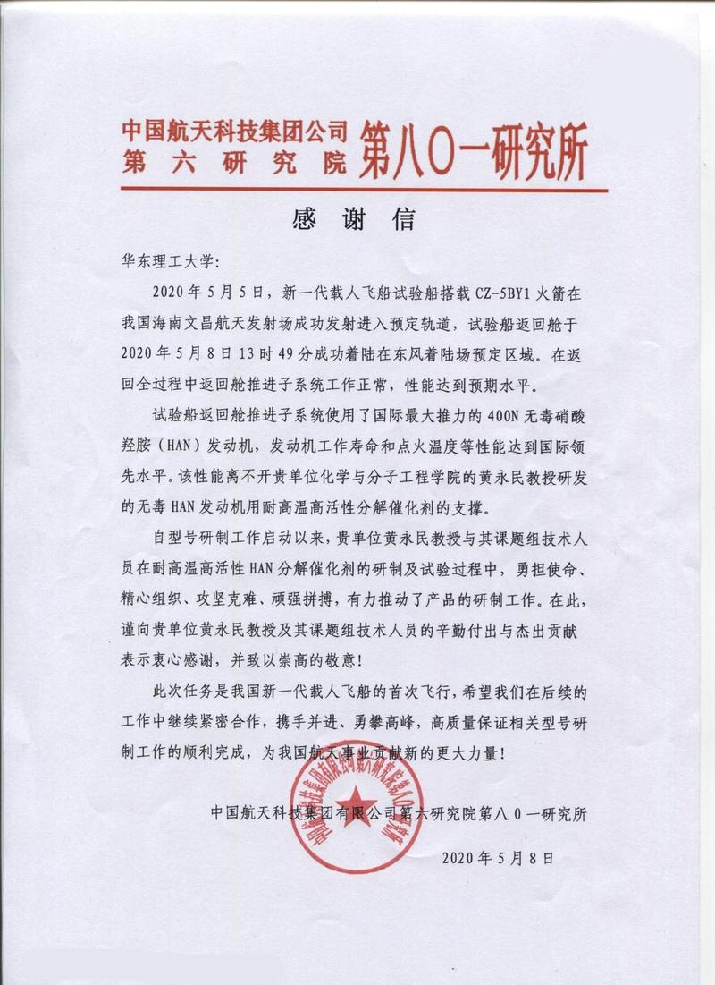 此次我国新一代载人飞船试验船姿控动力系统上配备的是国际上推力最大的HAN无毒单元发动机,这对催化剂的活性及高温稳定性提出了更为严苛的要求。作为大推力单元无毒发动机的关键功能材料,华东理工大学黄永民教授研制的HAN分解催化剂在此次空间飞行任务中表现完美,为新一代载人飞船试验船的安全返回、精准着陆提供了可靠保障。日前,中国航天科技六院801所向华东理工大学发来感谢信,致谢黄永民教授为型号研制所作的杰出贡献。