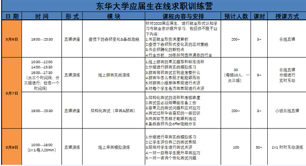 东华大学则在3月份组织开展2020届毕业生线上求职训练营。训练营针对网申、简历、面试等求职的诸多“痛点”“难点”,帮助广大毕业生树立自信,更从容地迈出从校园到职场的第一步。通过两场直播,在线模拟了9场群面演练和百余场1对1单人面试演练,全方位满足毕业生疫情期间“云求职”的各方面需要,两场直播累计有9300余人次观看。“自己考研成绩不太理想,面对春招有很多的焦虑和迷茫,这次求职训练营让自己明确了方向,课程中的求职干货大大增加了自己在疫情期间的求职信心。”计算机学院大四毕业生于同学说。
