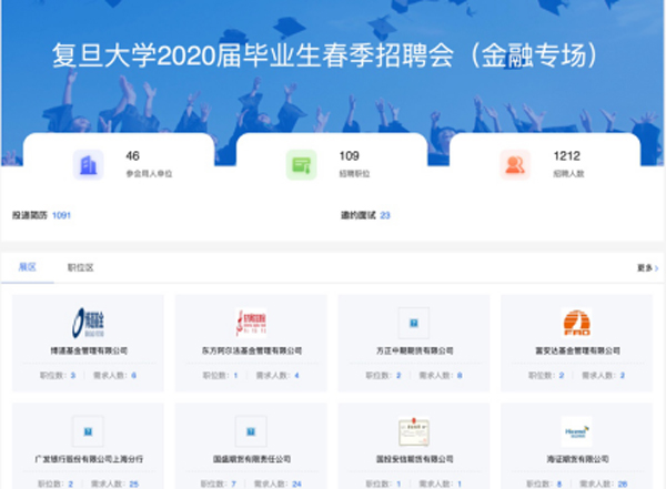 同样,为应对疫情新形势,复旦大学基于往年毕业生就业去向分析,推出“行业直通车”春季专场线上双选会系列,分行业、分类别对接毕业生多元就业需求,为用人单位和毕业生搭好“精准桥”、牵好“姻缘线”。2月以来,学校已发布5场线上双选会邀请函,参加企业300余家,发布空中宣传会近50场、招聘信息近千条,提供岗位超过万个。学校鼓励各院系结合学科特色,多渠道联系用人单位,拓展岗位资源。