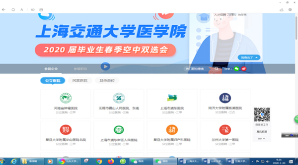 为确保线上招聘岗位既充足又优质,上海交通大学医学院所有辅导员及行政管理老师积极挖掘各种资源和渠道,主动联系用人单位,成功举办“上海交大医学院2020届毕业生春季大型空中双选会”,提供了超过3000个医学专业工作岗位,为用人单位和毕业生搭建安全、便捷、高效的空中双向选择平台。