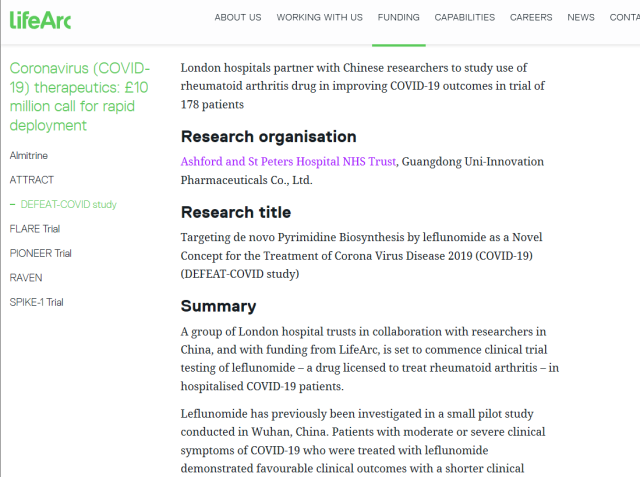 截至4月6日,生命爱科(LifeArc)共收到全球顶尖科研机构和制药企业提交的项目130多个。经过多轮严格筛选和评审,最终,由位于佛山的广东创药联和医药科技有限公司牵头组织实施的新冠肺炎治疗药物“来氟米特”获资助约合1320万人民币,用于开展国际多中心临床研究。